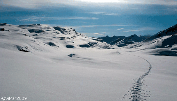 Prima escursione dell'anno. Dopo le feste, gli acciacchi di stagione e 2000 Km in quattro giorni, non vedevo l'ora di uscire. La giornata promette bene: sole, cielo terso e tanta neve. Parto dal villaggio di San Bernardino 1680m. Il sentiero che taglia più volte la strada del passo, é ben agibile. Faccio molte foto e in meno di due ore sono sul Passo del San Bernardino 2066m. Mi siedo al sole, godo del panorama e bevo del té caldo. Scatto ancora qualche foto e poi ridiscendo.