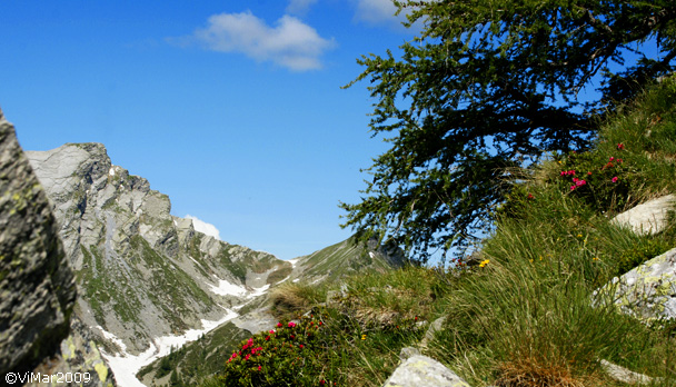 Appuntamento a Ponte Tresa alle h 6:00 per un’escursione in Val Vigezzo. Con l’idea di prendere la funivia, salire fino alla Piana di Vigezzo (1712m) e da lì partire per l’escursione, attraversiamo prima il Piano di Magadino e poi la bellissima Centovalli, e alle h 7:35 siamo a Prestinone. Ad aspettare la funivia con noi una comitiva che sale sulla Piana in cerca di funghi. La traccia preparata da Marino, e che abbiamo caricato sui GPS, prevede il giro intorno alla Cima di Trubbio (2066m) passando dalla Bocchetta della Cima (1865m). Arrivati alla piana di Vigezzo, ci incamminiamo sulla mulattiera costeggiata da larici e da rododendri in fiore. Il panorama si fa subito interessante: sulla nostra sinistra a chiudere la valle la caratteristica Pioda di Grana (2430m) e il Pizzo Scheggia (2466m); sulla destra la Valle Loana con la Cima della Laurasca (2195m), il Pizzo Stagno (1983m), in lontananza il Monte Zeda (2156m) e il Pizzo Marona (2051m), e dietro di noi l’inconfondibile sagoma del Monte Rosa (4634m) che si innalza maestosa sull’intero paesaggio. Seguerndo il sentiero che sale sempre di piu, arriviamo alla Bocchetta di Muino (1977m). Da quì invece di girare a destra, consigliati da un altro escursionista, decidiamo di cambiare itinerario e di proseguire verso i laghetti dell’Alpe di Ruggia (1887m), per poi salire alla Bocchetta di Ruggia (1990m). Attraversiamo la Bocchetta di Muino (1977m) e lasciatoci alle spalle la Val Vigezzo, un altro bellissimo paesaggio si apre davanti a noi: dapprima la Valle Onsernone e poi a scalare verso un orizzonte di nuvole, cime, valli e passi che si perdono nei cieli della Svizzera. I prati sono costellati di bellissime genziane blu e le pendici delle montagne ricoperte dal rosa acceso dei rododendri. Seguiamo il sentiero che si snoda alle pendici delle Schegge di Muina (2171m) e ci rattrista vedere i molti alpeggi, testimoni di una non lontana attività, del tutto abbandonati. Raggiungiamo un primo laghetto (1881m) e proseguendo verso Nord arriviamo al secondo laghetto presso le baite dell’Alpe di Ruggia (1890m). Il laghetto è molto bello e nelle sue limpide acque si specchia il Pizzo di Ruggia (2280m) che si staglia nitido nel blu del cielo. Facciamo qualche foto, ci incamminiamo sulla neve che ancora in parte copre il sentiero ed in breve siamo sulla Bocchetta di Ruggia (1990m). La bellissima vista sulla valle e sulle montagne circostanti, ci fa scattare molte foto. Nel cielo, che ora è ricoperto da qualche nuvola, volteggiano leggeri e colorati parapendii. Torniamo all’Alpe di Ruggia e ci fermiamo a mangiare su una collinetta a ridosso del lago. La giornata è molto calda ed è molto piacevole starsene seduti al sole, ma l’arrivo di grosse nuvole nere ci segnala che è ora di alzarsi e riprendere il cammino. Tra il primo ed il secondo laghetto ripassiamo davanti al piccolo Rifugio Ghezzi del CAI di Vigezzo, che, da poco ristrutturato, può accogliere circa sei persone. Ripercorrendo lo stesso sentiero dell’andata ci portiamo dapprima sulla Bocchetta di Muino (1977m) e poi alla Piana di Vigezzo(1712m). L’escursione, che si snoda tra paesaggi alpini di rare e intatta bellezza, ci è molto piaciuta e dirigendoci verso Domodossola salutiamo la valle con un arrivederci a questo autunno per un’altra escursione.