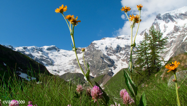 Partiamo da Varese alle ore 6:00 in direzione di Macugnaga per effettuare un’escursione al Lago delle Locce (2.209m). Alle ore 7:45 siamo a Pecetto (1378m), frazione di Macugnaga (1.372m), e aspettando la seggiovia che sale al Belvedere (1.904m) alle ore 8:30, approfittiamo dell’unico bar aperto per bere un caffé e scambiare qualche chiacchiera con altri escursionisti. La giornata é molto bella, il cielo é senza nuvole e il Monte Rosa, illuminato dal sole mattutino, é ben visibile davanti a noi. Arrivati al Belvedere, imbocchiamo. il sentiero che in diagonale ci porta sulla morena, e scavalcatola attraversiamo quello che resta del ghiacciaio. Ogni anno cambia conformazione, e adesso si è ritirato fin sotto le pendici della montagna. Raggiungiamo la morena opposta e con un’ampia diagonale arriviamo all’Alpe Pedriola (2065m), dove si trova anche il Rifugio Zamboni-Zappa (2.070m). Di proprietà del CAI sez. SEM Milano, ha una capacitä di 72 posti letto. Ci dirigiamo verso Nord-Est attraversando il bellissimo pianoro, fra pascoli, ruscelli, massi erratici e qualche marmotta che fugge fishiando per segnalare la nostra presenza. Risaliamo la ripida morena del Ghiacciaio delle Locce e arriviamo al lago delle Locce (2.209m), meta della nostra escursione. Il posto é incantevole, il lago di origine glaciale, alimentato dai ghiacciai del Monte Rosa e delle Locce, é quasi completamente ghiacciato e da quassù la colossale parete Est del Monte Rosa appare in tutto il suo splendore. L’emozione di trovarsi ai piedi di una delle montagne più alte dell’Europa occidentale é molto forte e sono ben visibili la Punta Gnifetti (4.554m), lo Zumstein (4.563m), la Dufour (4.634m) e la Nordend (4609m). Gli imponenti ghiacciai, le seraccate e le formazioni moreniche ci danno la sensazione di essere immersi in un paesaggio dell’era glaciale. Il silenzio é rotto solo dal rumore del ghiacciao e dai seracchi che staccandosi fanno alzare bianche nuvole. Facciamo qualche foto e ci rimettiamo in cammino. Attraversiamo con cautela il Ghiacciaio Nord delle Locce e iniziamo la discesa per raggiungere il lato Ovest dell’Alpe Pedriola. Da quì imbocchiamo il Sentiero Saglio che si snoda alla base del crestone Nord-Ovest della Punta Battisti (2.754m). Ci fermiamo a mangiare ai Piani Alti di Rosareccio (2.093m) vicino ad un vecchio impianto di risalita abbandonato e sono quasi le ore 14:00 quando ci immettiamo sul sentiero che con ampi tornanti inizia a scendere. Passiamo per l’Alpe Rosareccio (1966m), caratterizzata da vecchi ruderi abbandonati, attraversiamo il torrente Anza nei pressi dell’Alpe Burky e proseguendo sullo stradone in breve raggiungiamo il parcheggio di Pecetto. |
