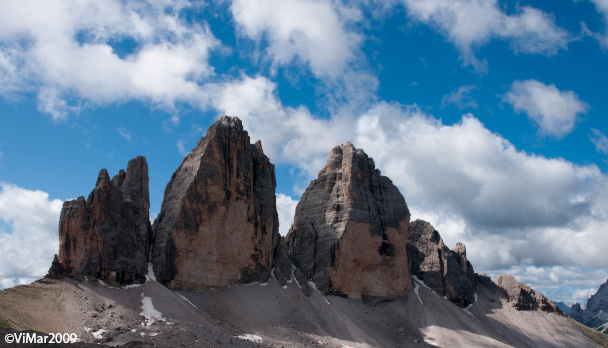 Partenza da Marchirolo (VA) alle ore 10:00 per una tre giorni nel luogo simbolo delle Dolomiti e delle Alpi, che con il Cervino, rappresenta un’icona dell’immaginario collettivo: le Tre Cime di Lavaredo. Marino che ha proposto l’escursione, ha preparato tutto con cura. Il percorso di Km 20 si snoda attorno alle Tre Cime. Primo giorno: arrivo al rifugio Auronzo (2.330m), cena e pernottamento; secondo giorno: passaggio dal rifugio Locatelli (2.405m), dal rifugio Pian di Cengia (2.528m) ed arrivo al rifugio Comici (2.224m), cena e pernottamento; terzo giorno: passaggio dal rifugio Lavaredo (2.344m) e ritorno al rifugio Auronzo dove è parcheggiata l’auto. Arriviamo al rifugio Auronzo (2.330m) alle ore 17:15. Prima di cena abbiamo il tempo di fare un breve giro fino alla Cappella degli Alpini. Anche se la nebbia non ci permette di vedere le Tre Cime, il paesaggio è veramente bello. Ceniamo e dopo qualche partita a carte saliamo in camera. Nella notte un violentissimo temporale si abbatte sulla zona con tuoni, fulmini, grandine e un forte vento che fa sbattere le finestre. L’alba però si annuncia con un colore dorato e un cielo terso che fa sperare in una giornata di sole. Colazione alle ore 7:00 e subito in marcia sul sentiero 101. La luce del mattino colora le montagne circostanti di un caldo arancione e sul sentiero sono visibili le pozzanghere lasciate dal temporale notturno. Arrivati alla Forcella di Col di Mezzo (2.324m) iniziamo a scendere fino a raggiungere le Sorgenti della Rienza (2.245m). Qui l’acqua scorre fresca e limpida tutto l’anno ed un filo invisibile collega queste sorgenti al Mar Nero: il fiume Rienza Nera è un affluente del fiume Drava che riversa le acque delle Tre Cime nel Danubio e quindi nel Mar Nero. Ci troviamo ai piedi delle Tre Cime, e si vedono cordate di rocciatori, che aggrappati alle pareti, con lenti movimenti, tentano l’ascesa alla Cima Grande (2.999m). Siamo talmente vicini che nel silenzio del mattino sentiamo chiaramente le loro voci. Percorrendo l’Alta Via delle Dolomiti, arriviamo al Rifugio A. Locatelli alle Tre Cime o Drei Zinnen Hütte (2.405). Da qui la vista sulle Tre Cime di Lavaredo è indescrivibile. La verticalità delle pareti Nord è impressionante, non esiste una simile morfologia in nessun altro gruppo montuoso delle Alpi. La Cima Ovest (2.973m), la Cima Grande (2.999m) e la Cima Piccola (2.857m), dal caratteristico colore dato dalla dolomia principale, si stagliano come cattedrali gotiche nel cielo ora solcato da nuvole bianche. Trovarsi qui è emozionante, queste pareti lasciano immaginare lontani eventi geologici caratterizzati da grandi catastrofi naturali. I tagli netti fanno pensare ad un brusco spostamento della Terra. La morfologia degli enormi strapiombi di roccia gialla che interrompono le mura, derivano dallo scioglimento di un antico ghiacciaio dell’altopiano che determinò molti crolli. Di tali eventi si può intuire la potenza camminando sui vasti ghiaioni sottostanti. Ci fermiamo al rifugio per una breve pausa, ci riforniamo di acqua e ci riportiamo di nuovo sul sentiero 101 per raggiungere la Forcella del Pian di Cengia (2.522m). Nel volgere un ultimo sguardo alle Tre Cime, che lentamente spariscono dietro la Forcella, un po’ di tristezza mi assale nel pensare che difficilmente ritorneremo ancora in questi luoghi. La tristezza svanisce subito davanti ad un ricco piatto di prodotti locali: speck, salame e formaggio, che, accompagnati da una fresca birra, gustiamo al rifugio del Pian di Cengia (2.528m). Il piccolo rifugio, solo 11 posti letto, gode di una bellissima posizione ed il grande terrazzo é molto soleggiato ed al riparo dai venti. Riprendiamo il sentiero 101 che scendendo ci porta al rifugio Comici (2.224m). Aspettando la cena sfoglio un libro con vecchie foto sulla Grande Guerra (1915-18) che si combatté nelle Dolomiti. Dalle trincee e dai molti monumenti ai caduti che abbiamo incontrato, appare subito evidente la forte attività bellica che c'é stata fra queste montagne. D’altronde le Tre Cime di Lavaredo da un lato, e le Drei Zinnen dall’altro, hanno da sempre segnato un confine tra due mondi e due culture diverse. Già dal Cinquecento tutta quest’area rimase contesa tra gli Austriaci e la Serenissima, causando ripetuti spostamenti di confine fino ad arrivare alla Grande Guerra. Nel 1915 il confine tra Italia e Austria era proprio sulla Forcella di Lavaredo (2.454m). Fin dall’11 maggio 1915 gli italiani occuparono per primi questo confine e gli austriaci, arrivati il giorno dopo, furono costretti a ritirasi verso l’interno. Il primo giorno di guerra, il 25 maggio 1915, gli italiani respinsero un primo attacco, ma i tiri degli austriaci colpirono, incendiandola, la casermetta sotto la Forcella di Lavaredo; ancora oggi sono ben visibili i suoi ruderi. Nell’intero mese di luglio gli alpini si impegnarono a portare un potente faro sulla Cima Grande (2.999m), e in un attacco notturno, per vendetta, distrussero il rifugio A. Locatelli alle Tre Cime. Sepp Innerkofler, proprietario e custode del Drei Zinnen Hütte, grande rocciatore e autore di numerose vie nelle Dolomiti di Sesto, vide bruciare il suo amato rifugio dalle cime del Monte Paterno (2.746m), da dove dirigeva i tiri degli austriaci. Anche il rifugio Auronzo subì numerosi danni a causa della guerra. Guardo queste foto e penso a quanti uomini sono morti fra queste montagne: circa 9.707 i caduti che riposano nel cimitero di Pocol; si stima che circa 10.000 furono i morti tra i due schieramenti tra il 10 ed il 13 dicembre 1916, dovuti alle valanghe ed al gelo; sul Monte Piana (2.324m) il 13 dicembre 1916 si registrarono 42 gradi sotto zero. A distogliermi da questi brutti ricordi, arriva il piatto di minestra calda che tutti e tre abbiamo ordinato e che mangiamo con gusto. Restiamo ancora un po’ a chiacchierare e ci ritiriamo in camera. La mattina sveglia alle ore 5:30 e partenza alle ore 6:00. Raggiungiamo il Passo Fiscal