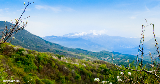 La strada sale senza tregua, per poi arrivare in una radura delimitata da un’enorme falesia, il Sasso Cadrega (622 m) e continuare fino a giungere in località Vallalta (831 m), dove i ruderi di Villa San Giuseppe, ex Caserma Cadorna, una lapide ed un pannello esplicativo, con le foto dei partigiani prima di essere fucilati, ricordano la Battaglia del San Martino. Continuiamo a salire fino a raggiungere una seconda falesia, che attraversiamo con cautela. Dal sentiero messo da poco in sicurezza, gli squarci che si aprono sulle valli sottostanti sono molto suggestivi. Peccato che la foschia non ci permette di vedere lontano. Dopo un ultimo tratto in pineta, intravediamo la chiesa di San Martino (1085 m), e quindi la cima della montagna, dove arriviamo passando prima dal Sacrario che sorge appena sotto di essa. Ci fermiamo a mangiare adagiati alla parete della chiesa osservando il panorama che si apre davanti a noi: a Sud il massiccio di Campo dei Fiori (1227 m), il Poncione di Ganna (993 m), la Martica (1032 m) ed il Monte Chiusarella (915 m). Verso Est il Lago di Lugano con le Prealpi svizzere ed il Monte Generoso (1701 m) e poi il Lago di Como, il Legnone (2609 m), le Alpi Orobiche ed i ghiacciai della media Valtellina. A Nord la vista scende a picco sulla Valtravaglia, su Germignaga, Luino e la parte settentrionale del Lago Maggiore con i monti che fanno da sfondo a questo paesaggio prettamente alpino. In primo piano troviamo il Monte Lema (1620 m), il Monte Gradicioli (1940 m) ed il Monte Tamaro (1961 m). Ad Ovest il Monte Zeda (2156 m), il Pizzo Marona (2051 m), il Limidario (2188 m) e poi la catena del Monte Rosa (4634 m) e ancora più in là fino a raggiungere il Monviso (3841 m). Nelle giornate ventose è possibile osservare, oltre la Pianura Padana, l’Appennino ligure-tosco-emiliano. Fa molto caldo, il termometro segna 34°C ed è piacevole starsene al sole. Dopo un gustoso caffè e qualche foto ci rimettiamo in cammino raggiungendo in breve la macchina. Per le bellezze naturalistiche dei luoghi e per il forte respiro della storia che ancora si sente tra i ruderi di queste montagne, abbiamo trovato questa escursione veramente interessante.